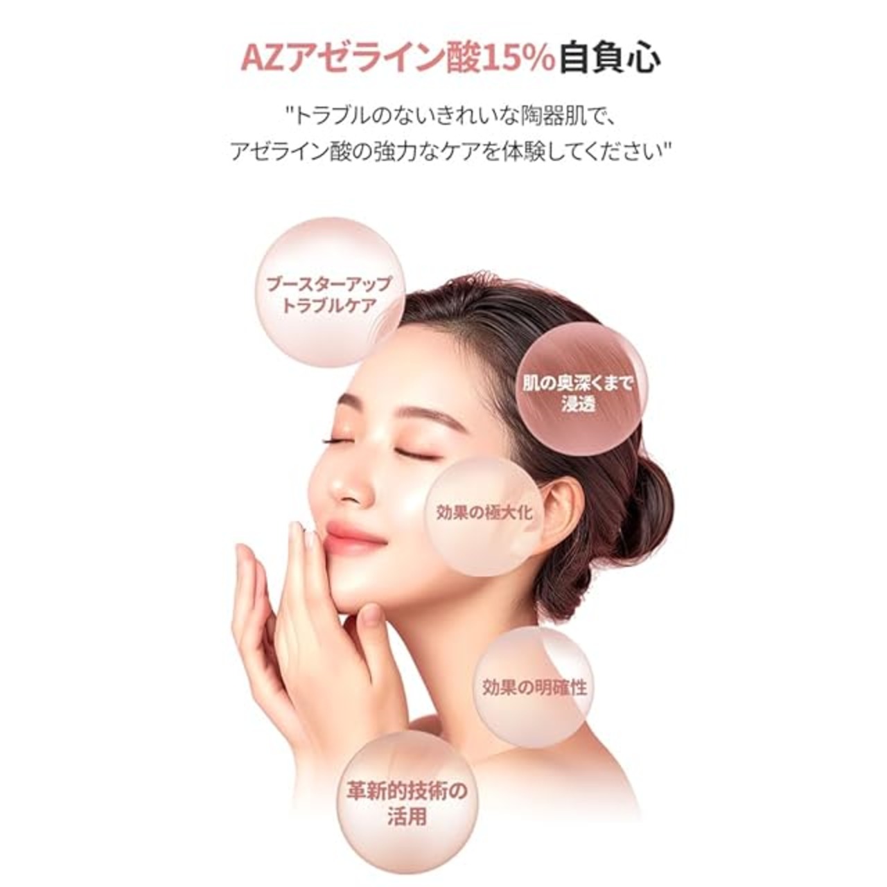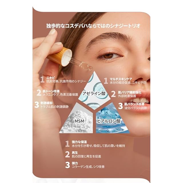 アゼライン酸15%に加え、MSMと低分子ヒアルロン酸を配合した集中ケア美容液です。