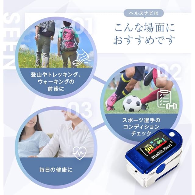 測定範囲 血中酸素飽和度(SpO2):50~100% 測定範囲 脈拍数:30~250bpm 測定範囲 灌流指数(PI):2.5~20%