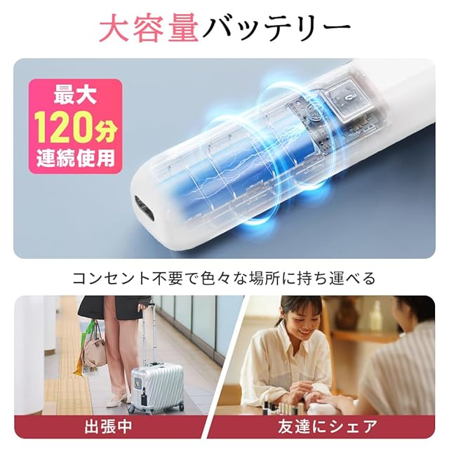 「USB充電式 & コンパクトで使いやすい!」:ネイルオフマシーンは電源に差し込む必要はありません、1時間充電すると、120分間連続使用できます。もちろん、電源を接続しながら使用することもできます。家庭用にも業務用にも最適です。コンパクトなサイズで外出、旅行や出張の持ち運びに便利!