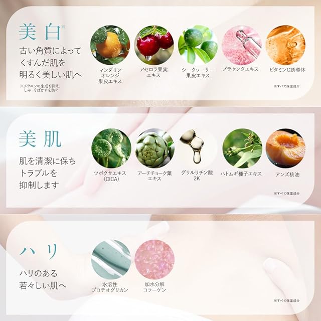 古い角質へメラニンの生成を抑えしみ、そばかすを防ぐ。マンダリンオレンジ果皮エキス、シークヮーサー果皮エキス、アセロラ果実エキス、プラセンタ、ビタミンC他にも嬉しい成分が20種類以上