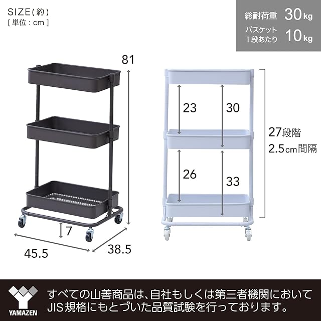 ●本体サイズ:幅45.5×奥行36×高さ81cm●収納内寸 : 1段目37.5×27.5×6.5㎝、2段目38.5×28.5×6.5㎝、3段目39×30×6.5㎝●床~土台高さ : 7㎝●耐荷重 : 全体30kg(バスケット1段あたり10kgまで)●構造部材 : フレーム、バスケット、スプリングワッシャー/金属(スチール) キャスター/ポリプロピレン テーパースリーブ/ABS樹脂●表面加工 : エポキシ樹脂塗装●東証(株)山善で扱うすべての山善商品は、自社もしくは第三者機関において、JIS規格に基づいた品質試験を行っております。