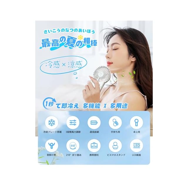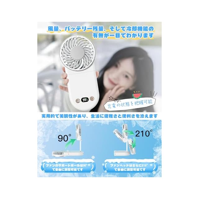 【コンパクトなのに強力送風&冷却プレート搭載&LCD液晶画面表示機能付き携帯ファン】空気力学に基づいたデザインにより、小型なのに送風は強い!7枚の羽根が搭載されて効率的に送風することができます。この冷却プレート内蔵の携帯扇風機、風を送るだけでなく、冷却スイッチを押すと冷却プレートが瞬時に冷却。 頬や額、手首、首元に当てるだけで、ひんやりとした涼感が広がります。真夏の酷暑の中でも、肌表面温度を外気温から最大20℃も下げ、ほてった顔を素早くクールダウン。熱中症予防に最適なアイテムです。 ハンディファンさらに高精細LCD画面を搭載,バッテリー残量が一目で確認できるので、充電タイミングを逃しません。