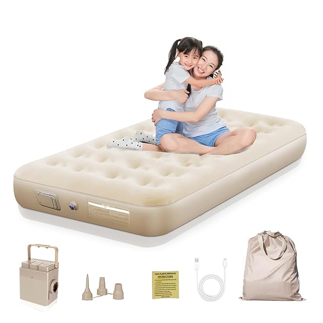 【限定】エアーベッド エアーマット 4000mAh電動ポンプ内蔵 LEDライト付きエアマット シングル 190×100×25cm 折り畳み式 マットレス 自動膨張 ワンタッチで空気抜け キャンプ マットレス Type-C充電式 取り外し可能 簡易ベッド 防水性・通気性・快適性 収納袋付き 日本語取扱書 来客用/防災用/車中泊/引越し/家庭用/アウトドア コンパクト シングル(ベージュ) | BASE LINE