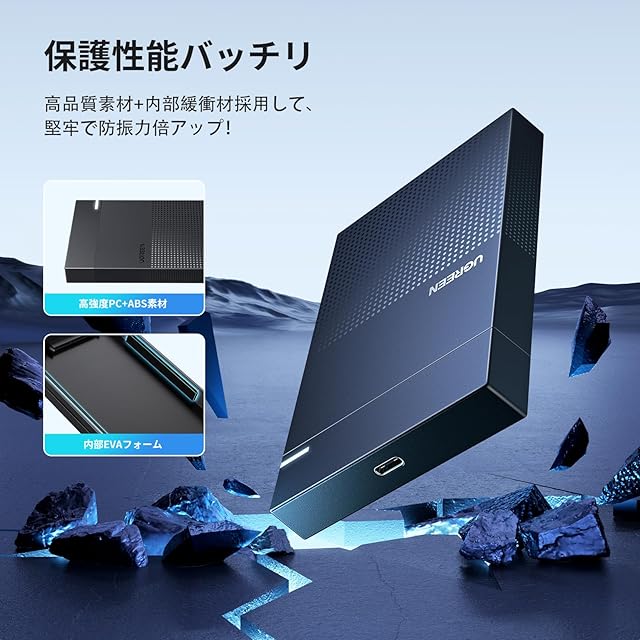 【衝撃や振動からしっかり保護】衝撃・擦り傷に強いABS素材を採用、そして防振クッションが内蔵されており、万が一HDD 外付けケースが落としてしまった時に、ドライブが故障してしまうリスクを大幅に軽減して大事なHDDやSSDをしっかり保護。
