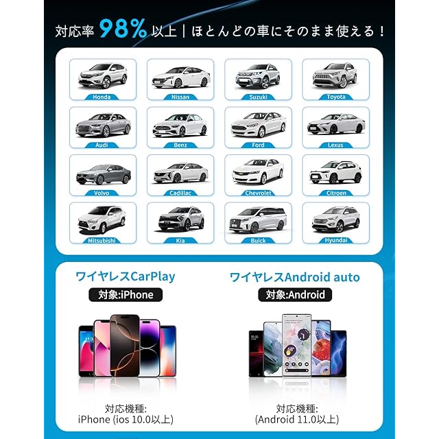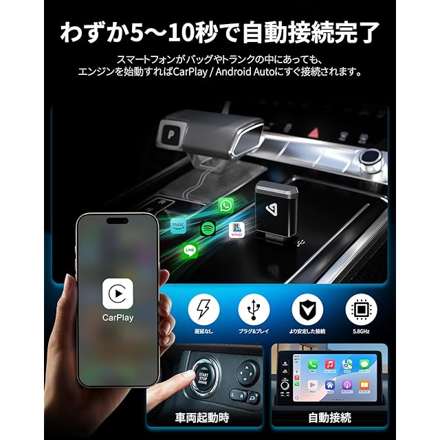 2 in 1:ワイヤレス CarPlay & Android Auto に対応:有線接続の CarPlay / Android Auto をワイヤレスに変換。ナビ、音楽再生、通話、音声アシスタントなどすべての機能をそのままに、スマートで快適なドライブを実現します。