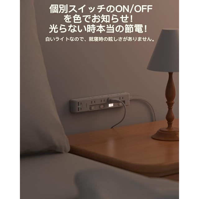 【節電スイッチ付き&干渉しづらいデザイン】コンセントには接続機器のON/OFFができるスイッチが付いており、使わないところは切って電力を節約することができます。スイッチLEDランプが付いており、一目で通電が見えて安心です。また目に優しい白い光なので、就寝の時眩しく感じることがないです。(※ご注意各スイッチは上下2つのAC差込口を制御します。)ACコンセントを2方向に分配して、どちら側からも気軽にケーブルを挿すことができます。また、180°スイングプラグを採用して、狭い場所でも配線しやすい。本製品は日本の電圧(100~125V)に合わせて設計されるので、日本国内のみ使用できます。
