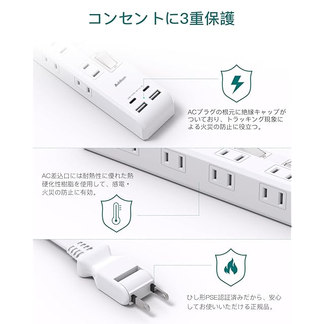 【雷サージ保護機能&コンセント4重保護】電気火災を防ぐため、ACプラグの根元に電気を通さない絶縁キャップがついており、トラッキング現象による火災の防止に役立ちます。 さらに、AC差込口には、万一の発熱の際にも融解しにくく、電気火災の防止に有効な耐熱性に優れた熱硬化性樹脂を使用しています。電源コードには、二重被ふくコードを採用していますので、断線や被ふく破れによる感電・火災の防止に有効です。雷サージ保護機能より、サージ、電圧スパイク、電圧ノイズ、静電気による干渉を排除し、電気製品の耐用年数を効果的に延長します。