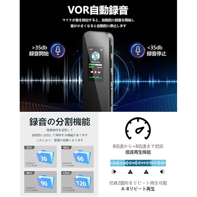 【ワンタッチ録音&多機能サポート】ワンタッチで録音を開始でき、重要な瞬間を逃しません。この録音機は、VOR音声制御録音機能を搭載しており、一度有効にすると、周囲の音量を自動的に検知し、音が検知された場合のみ録音を開始し、無音の場合は録音を停止します。これにより、録音ファイル内の無駄な部分を効果的に削減し、ストレージスペースを節約することができます。さらに、分割録音機能も備えており、ユーザーは録音ファイルの分割時間を設定することができます。録音中、レコーダーは設定された時間ごとに自動的に分割して保存しますので、長時間の録音ファイルをより簡単に管理および確認することができます。