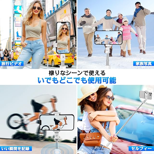商品名:自撮り棒・じどり棒・スマホ三脚 103cmまで伸縮可能・Bluetooth5.2リモコン付き【360°回転・軽量・折りたたみ式】iPhone6-16Pro Max/Android対応・安定性アップ・日本語取扱説明書付き【コンパクト・7段階伸縮・セルフィー/撮影/生配信/動画鑑賞対応】(しろい)