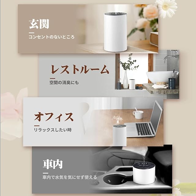 【広い空間対応・色々なシーンで活躍】車内はもちろん一瞬で香るとともに、なんと10~60平米まで有効芳香面積に対応し、家庭、オフィス、お店舗、ヨガ室、瞑想など幅広くお客様からご愛用いただいております。(スペースの風通し状況による若干異なる)