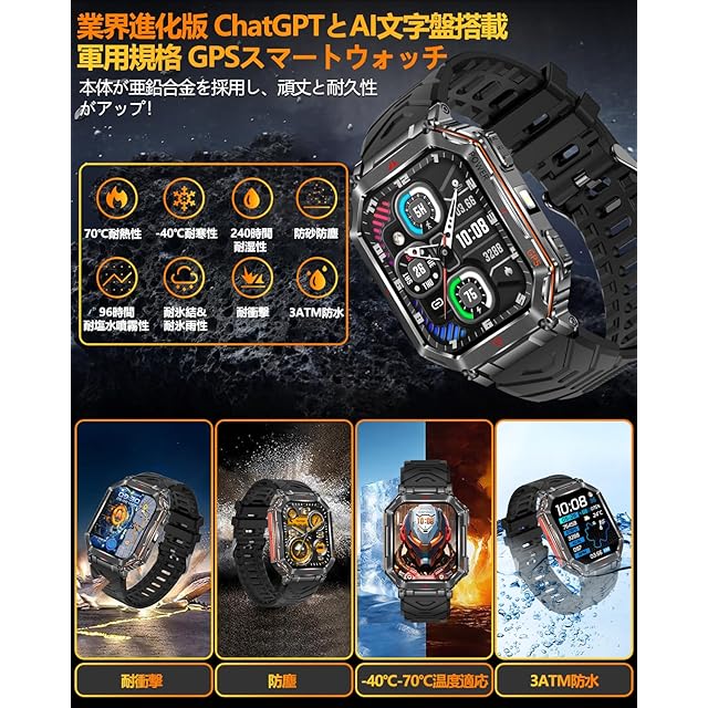 商品名:スマートウォッチ【2025年業界新登場 ChatGPT搭載 AI文字盤 GPS内蔵】高輝度懐中電灯 軍用規格 2.01インチ大画面 Bluetooth5.3通話 スポーツウォッチ 3ATM防水 耐衝撃 GPS運動軌跡記録 腕時計 長持ちバッテリー 100+運動モード DIY文字盤 高度計 気圧計 コンパス Lineなどアプリ通知 歩数計 iPhone アンドロイド対応 日本語説明書 (ブラック)
