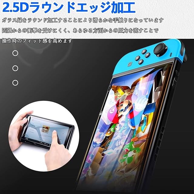 【対応機種・ブルーライトカット】Nintendo Switch 専用に設計した 保護フィルム なので、必ずご購入前にお使いの携帯電話の機種をご確認ください。ブルーライトとは、自然界にも存在する波長が短く強い光で、角膜や水晶体で吸収されずに網膜まで到達し、目や睡眠に影響を及ぼしています。本製品にはブルーライトカットコーティングが施されているので、目の負担を減少させられ、長時間眺める方に優れる効果が発揮できます。画質を損なわないで お客様の目をゲーム機から発せれる光から守ります。 【ラウンドエッジ加工・99.9%高透過率】真空メッキプロセスを使用し、正しい丸みをエッジ処理して、不快感がありません。しかもエッジ部分へ衝撃が少なく、快適で滑らかな肌触りを提供する同時に、使用中に鋭い角のエッジで指を傷されません。液晶画面の隅から隅までしっかり保護できるフルラウンド設計です。0.3mmの厚さでタッチスクリーンの感度がよく、なめらかな指滑りでゲームを今まで以上に体験しましょう。99.9%高透過率を用いる高級素材を採用しておるので元々の画面の色鮮やかさが変わらない高透明度を持ち、画質を損ねず、違和感なくゲームを楽しめます。