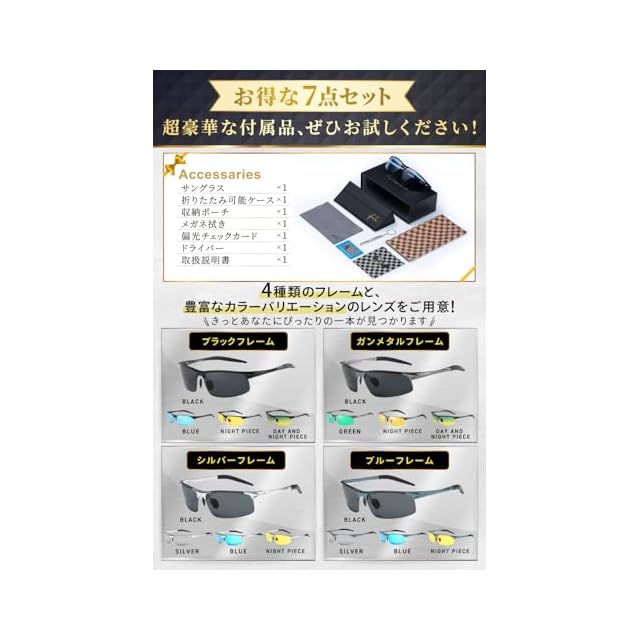 【豪華7点付属セット・豊富なカラーレンズであなたに最適なサングラス】 ✅豊富な付属品が嬉しいお得な7点セット!折りたたみケース、収納ポーチ、メガネ拭き、ドライバー、偏光チェックカード、取扱説明書が含まれています。 ✅4種類のフレームと豊富なカラーバリエーションのレンズをご用意しており、きっとあなたにぴったりの一本が見つかります。