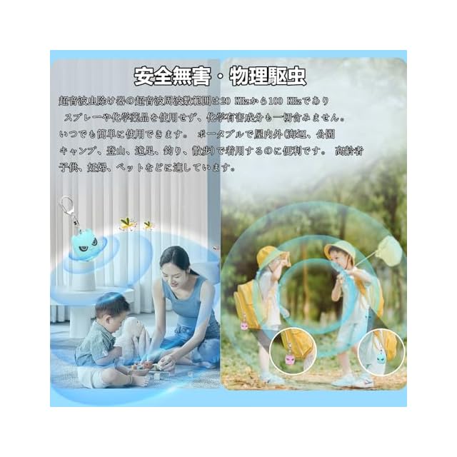 【持ち運び便利・幅広い用途】超音波強力蚊よけ、超音波は人体に害を与えず、化学薬品や薬剤を含まず、電波もないので、放射線の心配がありません。スタイリッシュな外観 ストラップは、コンパクトで場所を取らず、吊り下げ具もつきましており、服やカバンなどに掛けて持ち運びも簡単です。いつでも気楽で手軽に使用できる。重量わずか 20 グラムのこの虫除け ベランダ 強力。また、殺虫効果がなくため、死骸の後始末にも悩まない。 いつでも簡単に使用できます。 ポータブルで屋内外(海辺、公園、キャンプ、登山、遠足、釣り、散歩)で着用するのに便利です。 高齢者、子供、妊婦、ペットなどに適しています。