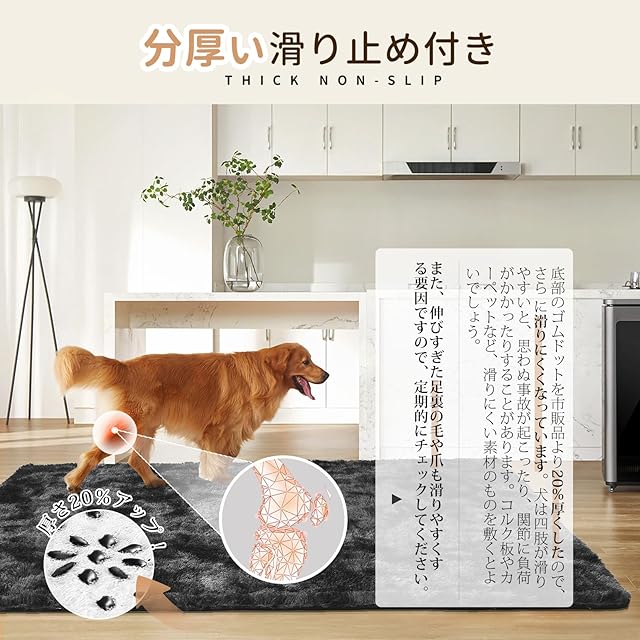 【滑り止め20%アップラグ】お子様や高齢者、ペットのいるご家庭の安全を確保するために、特別にゴムドットの厚みを強化しました。これにより、高齢者がカーペットの上を歩く際に滑る心配をせずに安心して歩けるようになり、お子様が遊ぶ際もより安全に走り回ることができます。また、犬が膝蓋骨脱臼を起こして動物病院に行く回数も減らすことができます。
