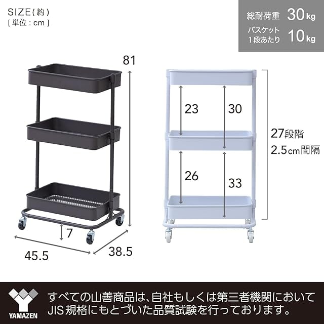 ●本体サイズ:幅45.5×奥行36×高さ81cm●収納内寸 : 1段目37.5×27.5×6.5㎝、2段目38.5×28.5×6.5㎝、3段目39×30×6.5㎝●バスケット外寸()内はリングを含む : 1段目39(43.5)×29×7cm、2段目40(44.5)×30×7cm、3段目41(45.5)×31.5×7cm●床~土台高さ : 7㎝●耐荷重 : 全体30kg(バスケット1段あたり10kgまで)●構造部材 : フレーム、バスケット、スプリングワッシャー/金属(スチール) キャスター/ポリプロピレン テーパースリーブ/ABS樹脂●表面加工 : エポキシ樹脂塗装●東証(株)山善で扱うすべての山善商品は、自社もしくは第三者機関において、JIS規格に基づいた品質試験を行っております。