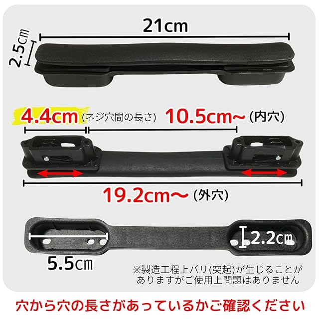 【簡単交換】Leap Raupeのスーツケースハンドルは、特別な工具や専門的な知識を必要とせず、付属のネジとプラスドライバーだけで誰でも簡単に取り付け可能。旅行前にスーツケースの持ち手が壊れた場合でも、修理に出したり新たにスーツケースを購入する必要がなくなります。 【経済性】こちらのハンドルは耐久性があり握りやすい設計なので手がつかれず快適な旅行をサポートします。コストを抑えつつ、スーツケースを長く使用することができます。 【耐久性】この交換用ハンドルは、高品質な素材を使用して製造されており、長期間の使用にも耐えることができるので、頻繁に旅行する方やビジネスで頻繁に移動する方でも安心してご使用いただけます。 【汎用性&快適な使い心地】この交換用ハンドルは、多くのブランドのスーツケースにも適合します。お持ちのスーツケースのブランドに関係なく、このハンドルを使用して修理することが可能です。 人間工学に基づいて設計されています。長時間の持ち運びでも手に負担をかけません。旅行中のストレスを軽減し、より快適な旅行体験を提供します。 【ご確認ください】ご購入前に、ご自身のスーツケースやキャリーバッグのハンドルサイズと、商品ページのサイズが合致しているかをご確認ください。