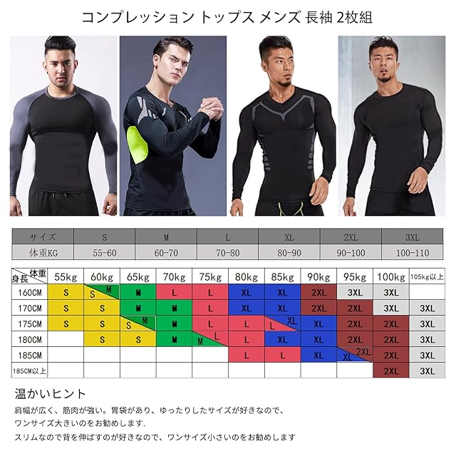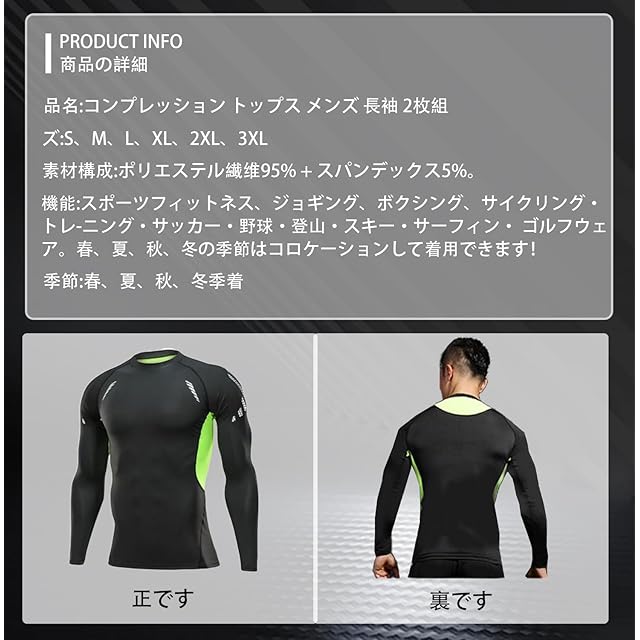 【素材構成】ポリエステル繊?95% + スパンデックス5%。コンプレッション トップス メンズ 長袖 2枚組 スポーツシャツは伸縮性のある素材で身体にフィット。程良い着圧で運動時の身体の動きを妨げない。様々なスポーツでの運動パフォーマンスの向上に役立ちます!夏場は汗をかいても快適でインナーとして使えば冬場の防寒対策にもなります。ランニングやスポーツ、運動を快適に楽しめます。