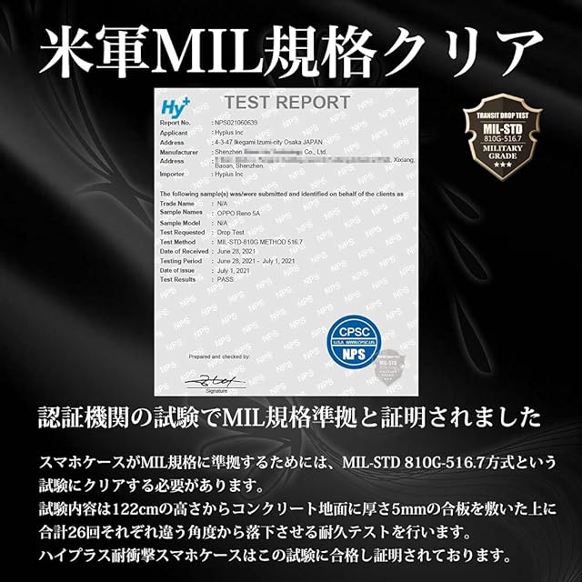 【スマホを落としてしまっても衝撃を最小限に抑えるケース】スマホが日常の生活に溶け込む現代で、落下などによるスマホの破損は販売台数に比例して増えている状況です。本ケースの角には落下時の衝撃を吸収するエアポケットを備えており、万が一スマホを落としてしまった場合でも、落下時のダメージを最小限に抑えることが可能となっており、その耐衝撃性能は第三者機関の試験による米軍MIL規格をクリアするほど高いことが証明されております。また、OPPO Reno5A専用にオリジナル設計しているためぴったりとフィットし、保護性能には欠かせないポイントとなっています。