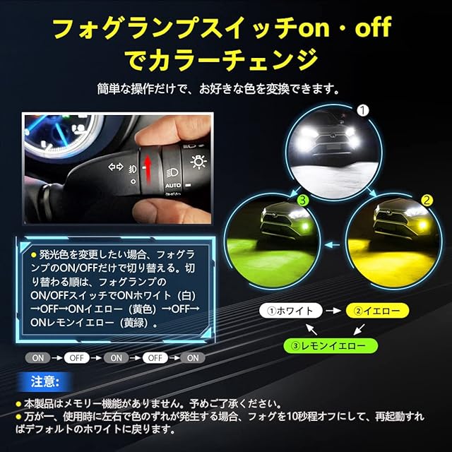 「もうよくあるホワイトやイエローに飽きた!ライムグリーンのフォグに交換しょうかな~でも普段はホワイトとイエローのほうがいい。いや~やっぱりライムグリーンのフォグに交換したいな~」って悩んだ経験がないですか?こちらの3色フォグならこんな悩みを解決できます!普段は天候に合わせて、ホワイトとイエローを利用したい、オフ会時や夜間撮影の際はライムグリーンを派手に点灯したい方にオススメ!
