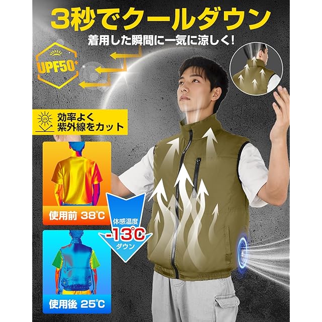 【高品質な生地】UVカット素材採用の空調ベストなので紫外線を99%カットでき、外の熱を遮断し直射日光の下でも衣服内温度上昇を抑えられ、極上の涼感をもたらします。さらに優れた通気性と速乾性を備えており、汗のべたつきを効果的に解消でき、さらりとドライな着心地をキープします。