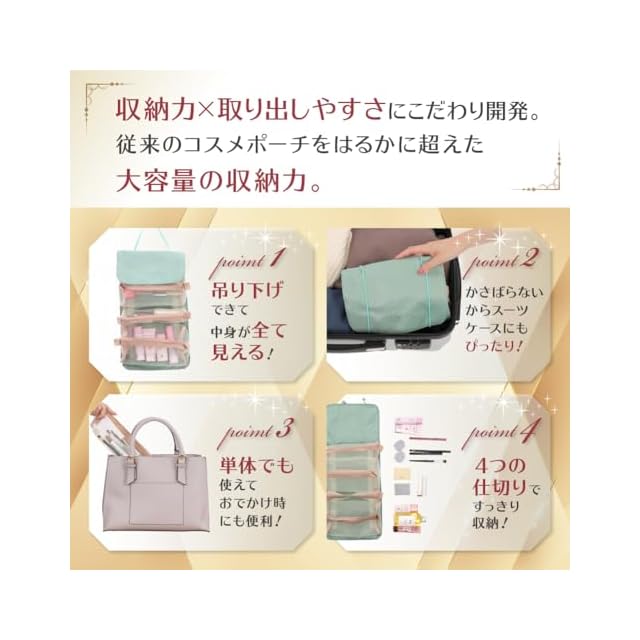 美容インフルエンサー本田麻実さん監修の元、「こんなコスメポーチが欲しかった!!お客様のリアルな声」を商品化! 4つの独⽴した収納ポケットとゴムバンドによる調整機能で、旅⾏や出張、お泊まりデートにも対応できる⼤容量の収納⼒を実現。 旅先などに持ち運びしたい化粧⽔などを詰め替えなし収納することが可能です。 収納部分の下にベルクロが付いており、4つの収納部分をそれぞれ単独で持ち運べます。温泉やプール、ジムなど、必要な時にほしいメイク道具だけを持ち運べるよう「利便性」を追求しました。 美容家の視点で「中⾝が⾒える」「アイテム別収納ができる」「独⽴して持ち運べる」にこだわり、これまでのコスメポーチをバージョンアップさせて⼤容量°—多機能収納を実現しました。 【使い⽅次第で⽤途が広がる多⽬的設計】コスメ⽤品、ヘアメイク⽤品、ネイルケア⽤品など、⾝の回りのメイク道具を1つにスッキリ収納できます。 その他、サニタリー⽤品やヘッドホン、モバイルバッテリーからサプリメント、薬など、アイディア次第で収納しづらかったアイテムをまとめてバッグにインできる仕様です。バッグインバッグとしてもおすすめ! 【⼤容量なのに場所を取らない!ロール状スタイル】付属のゴムバンドでクルッと巻いて収納できるので、、バックやスーツケースに収まりが良いのもポイント。バンドを外すだけで、ほしいアイテムをサクッと取り出せるため、「時短」に繋がる嬉しいメリットも! 【メイクアイテムが迷⼦にならない「⾒える収納」】ポーチの中でアイテムが迷⼦にならないよう「⾒える」にこだわりました!4つの収納部にメッシュ素材を使⽤することで、⽬で情報をキャッチしてほしいアイテムを取り出せます。 【お顔に使うメイクアイテムだから衛⽣⾯にもこだわりました!】 製品の表⾯に防⽔性と対摩擦に優れた⽣地を使⽤。防水性が⾼く、⽑⽟などができにくい材質なので⽇常使いにおすすめです。また、収納部には通気性抜群のメッシュ素材を使⽤しており、衛⽣的にメイク⽤品などを保てます。 【最長365⽇付きでサポート] 商品の企画から販売まで国内で⾏っており、品質管理についても徹底化しています。が、万が⼀不良品がございました時には最⼤365⽇で対応させていただきます。(通常は90⽇からのアップグレード対象)