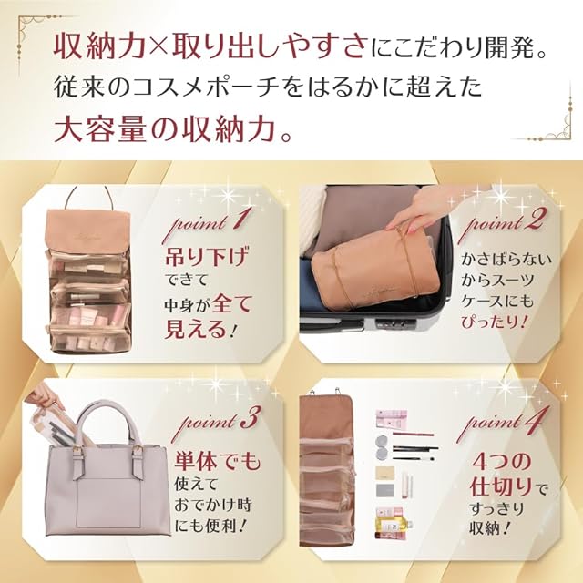 商品名:メイクポーチ トラベルポーチ 大容量 【現役モデル&美容専門家監修】【信頼の日本ブランド】 化粧ポーチ コスメポーチ 便利グッズ 旅行 防水 折りたたみ 吊り下げ 化粧品バッグ 収納バッグ (ベージュ)