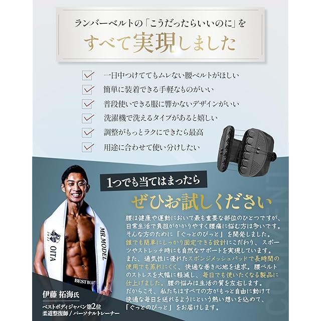 専門家推薦!プロが選んだ安心の設計。 柔道整復師・パーソナルトレーナー・ベストボディジャパン第2位の伊藤拓海先生も推奨。 「多数の腰サポーターを見てきた中でも、簡単に、かつしっかり固定できる。さらに、通気性が良いメッシュ構造で、すべてが揃った理想形。」 と高評価をいただいています。
