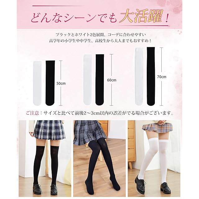 【どんなシーンでも大活躍】ニーハイソックスはファンション性にもこだわり、ブラックとホワイト2色展開でコーデに合わせやすいです。50/60/70cmの長さで、高学年の小学生や中学生、高校生から大人までもおすすめのハイソックスです。このニーハイソックスは、通学や通勤、卒業式や入学式などミニスカートやショートパンツ、制服だけではなく、コスプレ、ダンス、パーティー等にもよく似合い、どんなシーンでも大活躍!