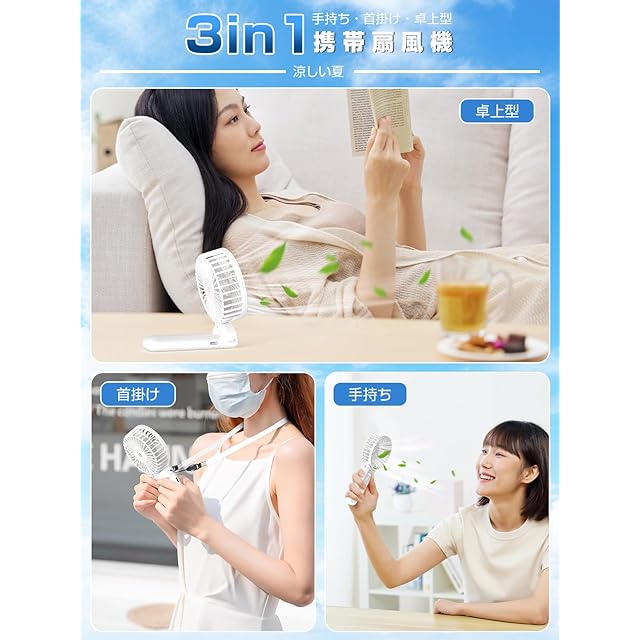 【手持ち/首掛け/卓上3in1携帯扇風機登場】手持ち扇風機・卓上扇風機・首掛け扇風機3つの機能を同時に兼ね備える扇風機です。✨扇風機本体にストラップ取り付け穴を備え、付属のストラップと併用すると首掛け扇風機として使え、両手が解放するため、長時間使っても疲れにくく、作業中やスポーツなどの場合に勧めします。【180°折り畳め】伝統の卓上扇風機と違う、弊社の扇風機は折り畳むことで卓上機能を実現します。上下方向に180°折り畳む可能、自分の好みに合わせて角度を調整できます。暑い季節、ちょっとしたお出かけから野外イベントまで活躍するハンディ扇風機です。注意充電中に以下の事を守ってください:①必ず付属の充電ケーブルをご使用ください。②アップルの電源アダプターをご使用しないでください。③必ず5v/2Aもしくは5v/1Aの外部電源と接続してください。