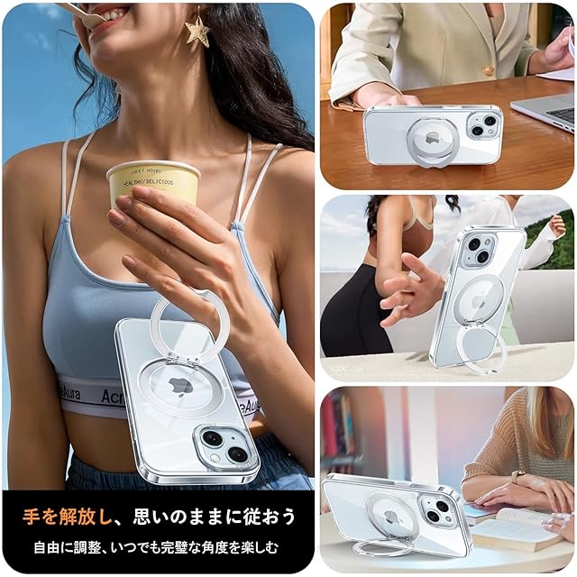【多機能360度!縦も横も思いのまま!】:背面に搭載された嵌め込み式リングは、安定したアルミ合金製の円形スタンドを採用しており、従来のリングと比較して滑りにくく、安定したグリップを提供します。360°回転スタンド機能により、縦置き・横置きどちらの状態でも安定して利用でき、0°~ 120°の間で多角度自由に調整できます。動画視聴やFaceTimeを利用する際には、両手を解放し。外出先でも手軽に使用でき、リングやスタンドを持ち歩く必要がない。ケースを開けるだけでスタンドの完成!指にかければリングも便利に使用でき!ケースを閉じれば背面はスマートに平坦に。無限の使い方が可能で、機能性を重視する方にはぜひ手に取ってみてください!【 iphone 14 Plus 用 ケース アイフォン14Plus 用 ケース アイホン14プラス 用ケース】
