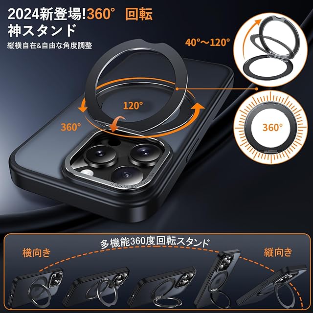 【多機能360度!縦も横も思いのまま!】:背面に搭載された嵌め込み式リングは、安定したアルミ合金製の円形スタンドを採用しており、従来のリングと比較して滑りにくく、安定したグリップを提供します。360°回転スタンド機能により、縦置き・横置きどちらの状態でも安定して利用でき、0°~ 120°の間で多角度自由に調整できます。動画視聴やFaceTimeを利用する際には、両手を解放し。外出先でも手軽に使用でき、リングやスタンドを持ち歩く必要がない。ケースを開けるだけでスタンドの完成!指にかければリングも便利に使用でき!ケースを閉じれば背面はスマートに平坦に。無限の使い方が可能で、機能性を重視する方にはぜひ手に取ってみてください!【 iphone 14 Pro Max 用 ケース アイフォン14Pro Max 用 ケース アイホン14プロマックス 用ケース】