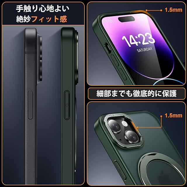 iPhone 15 Plus 用 ケース Magsafe対応 ワイヤレス充電 360°回転スタンド 縦横両対応 Gunwon スマホケース iphone15 Plus 用 米軍規格 耐衝撃 半透明 マット感 マグセーフ 防指紋 リング マグネット搭載 アイフォン15プラス 用 カバー「グリーン」 | BASE LINE