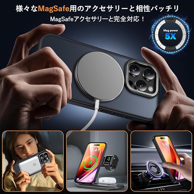 【MagSafe対応・磁力アップグレード】:強力なN52磁石を搭載しており、磁石吸着力は従来より10倍高め、ケースを装着したまま高速ワイヤレス充電が可能です、充電時の熱を周囲に発散して。Magsafe充電がかつてないほど簡単にできます!強い磁力により車運転中の激しい振動でもMagsafe車載ホルダーから外れることなく、市販のあらゆるMagsafeアクセサリーに簡単対応!いくら振っても落ちないので、充電しながらゲームをやっても問題なし!【 iphone 15 Pro Max 用 ケース アイフォン15Pro Max 用 ケース アイホン15プロマックス 用ケース