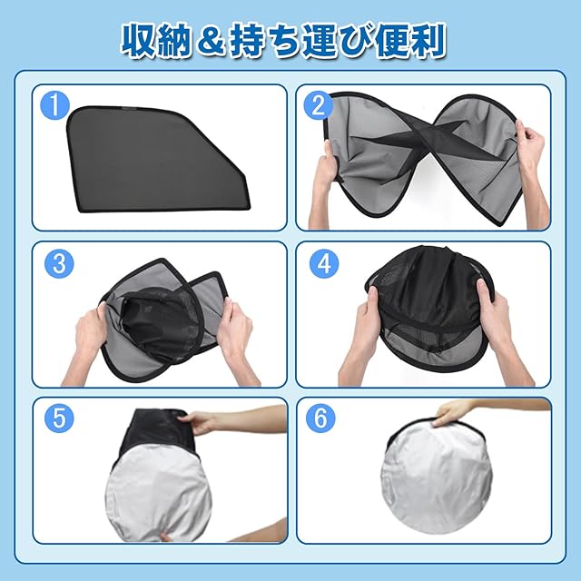【マグネット式・窓の開閉が影響無し】取り付けはマグネット式でワンタッチ!カーテン縁側にマグネットが内蔵されており、車窓の金属フレームにつけるだけで誰でも簡単に着脱が出来ます。磁石で付くのでドアを開けても基本落ちることもないです。※金属フレームではない場合、付属するマジックテープとフックで固定してください。使用しないと、数秒間で折りたたんで収納袋に入れてスッキリです。装着状態での窓の開閉が可能で、使いたい/使いたくないときはすぐに対応ができます。