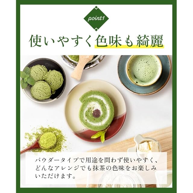 抹茶の深い味わいと鮮やかな緑色が、ケーキやクッキー、アイスクリームなどのスイーツに絶妙にマッチします。少量でもしっかりと風味を引き出します。