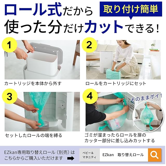 【臭い・菌を99%カット】子育て中の気になる臭いを漏らさない大容量のおむつポットEZkan(イージーカン)。幅広の投入口で紙おむつだけでなくペットシーツや介護用シーツもラクラク捨てられます。フットペダルで外フタをラクラク開閉!ゴミを片手で手軽に捨てられます。ペダルを離せばフタはゆっくりとと閉まって音や衝撃が少ない仕様です。 【取り換えやすいロールタイプのリフィル】ゴミ箱の内側のカートリッジを本体から外し、専用の取換ロール(リフィル)をセットして先端を結ぶだけで簡単に取り付けできます。ゴミが溜まったら扉内側でロールを引き出してカットして手を汚さずにポイッ!高密度ポリエチレン製のリフィルとゴミ箱の2重フタで防臭性能でしっかりと臭い漏れを防ぎます。 【使いやすい便利な機能】内フタを取り外せば開口部が26cmまで拡大。大きなゴミもストレスなく捨てられます。外フタはお子さまやペットのお留守番でも安心な開閉ロック付きで、ストッパーを使えば開けっ放しに固定も可能です。背面にはお掃除に便利な持ち手になるくぼみ付き。内フタを外せば自治体指定や一般的なごみ袋も取り付けが可能です。子育てが終わった後も、通常のごみ箱としてやペット(ペットシーツやネコ砂に)、日常の生ゴミ処理、介護などの幅広い用途に長くお使いいただけます。ママ・パパの使いやすさにこだわりました。 【インテリアに溶け込むデザイン】おしゃれなリビング、キッチンや子供部屋にも自然に溶け込むスタイリッシュでシンプルなデザインとカラー。大容量なのに薄型だからトイレや洗面所などにも省スペースで置きやすいサイズ感です。