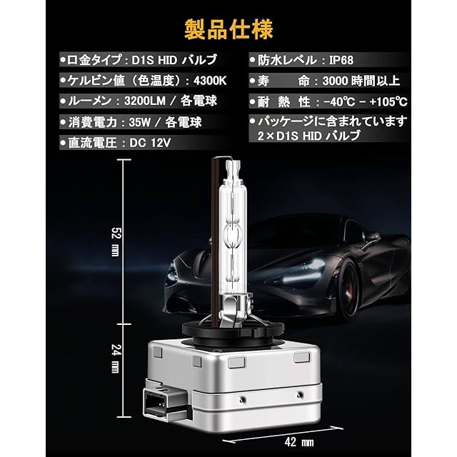 商品 スペック:厳選検査の車用 D1S HIDヘッドライト。型番:D1S HIDバルブ;色:暖白色(4300K);ワット数:約35W;電圧:DC12V;動作環境:-40℃~+105℃;防水等級:IP68;セット内容:バルブ×2,取扱説明書。ご購入する前には、色温、型式、サイズを必ずご確認下さい。(ご注意:車種によっては装着できかねる場合がございます、「D3仕様車にD1バルブは取付不可」)。万が一商品が問題あるなら、ご遠慮なく「店名」-「質問する」の手順でクリックして連絡ください