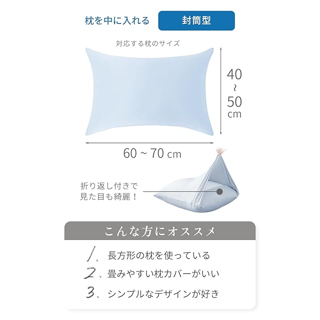 「封筒式デザインで、誰でも簡単装着」封筒式デザインを採用しているので、枕をふんわり半分に折ってスッと入れるだけ!とっても簡単です。