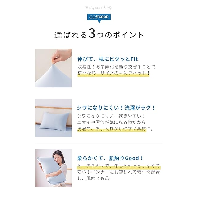 「3Dストレッチでぴったりフィット」枕カバーは、ポリエステル93%・スパンデックス7%の柔らかな素材で仕立てました(43×63cm)。3Dストレッチ素材だから、伸びがいい、いろいろなサイズの大きめな枕(50x70cm)にふんわりフィット。心地よい眠りをサポートします。