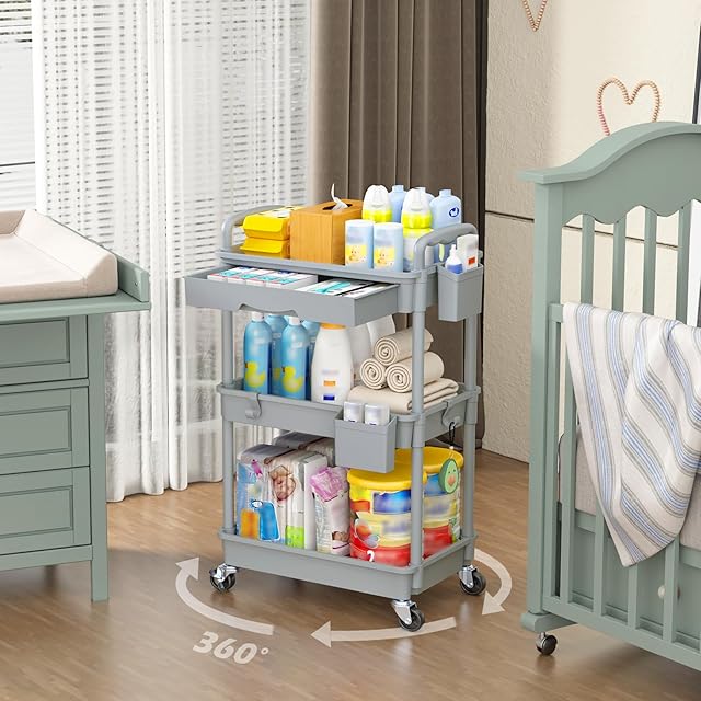 Goovilla キッチンワゴン ローリング 3段 引き出し付き ハンドル付き 収納カップ 仕切板付き 多機能 小物 隙間収納 バスケットラック バスルーム オフィス キッチン用 収納ワゴン 幅37.8×奥行26.9×高さ75.9cm グレイ | BASE LINE