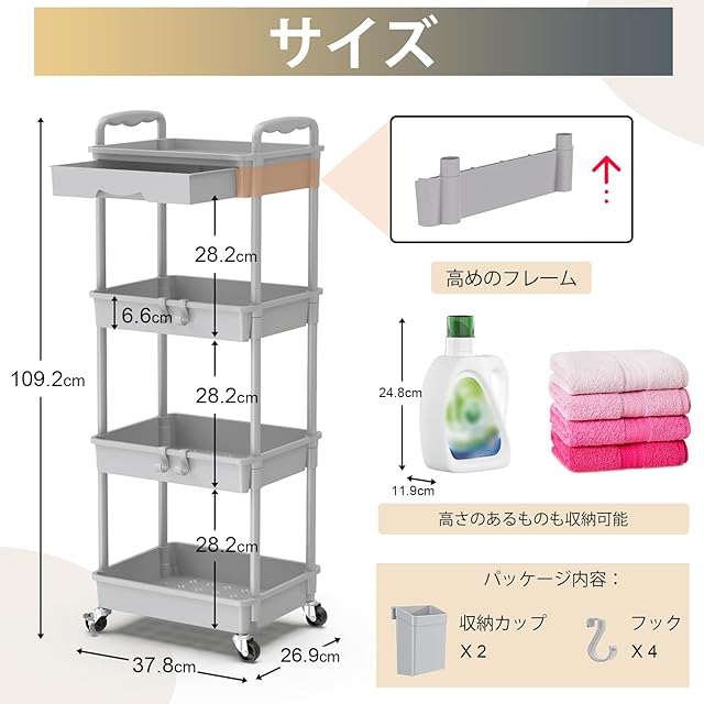 商品名:Goovilla キッチンワゴン ローリング 4段 引き出し付き ハンドル付き 収納カップ 仕切板付き 多機能 小物 隙間収納 バスケットラック バスルーム オフィス キッチン用 収納ワゴン 幅37.8×奥行26.9×高さ105.9cm グレイ