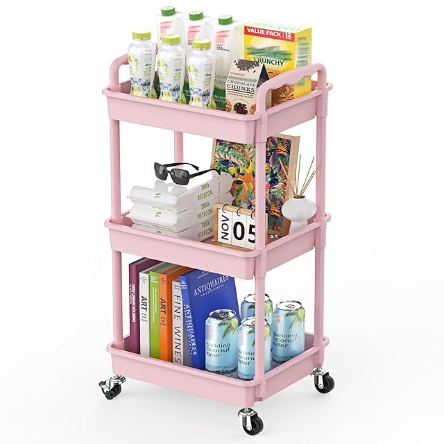 Goovilla キッチンワゴン ローリング 3段 ハンドル付き 移動式 隙間収納 バスケットラック バスルーム オフィス キッチン用 洗面所 頑丈 小物収納 収納ワゴン ピンク | BASE LINE