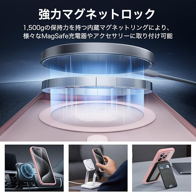 【強力吸着・MagSafe対応】ESR いphone15promax ケースは1,500 gの吸着力を持つ強力な内蔵磁石により、それにより、多種なマグネットアクセサリーとの素晴らしい組み合わせを実現でき、ガッチリ吸着する事でスマホケースを装着したiphone 15 pro maxを急速にワイヤレス充電できます