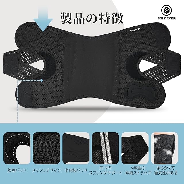 【SOLOEVER 膝サポーター】は、膝関節をしっかりサポートするために4本の金属スプリングを搭載しています。これにより、膝の動きを安定させ、筋肉や腱、靭帯を保護し、自然な動きがサポートされます。側面からの強力なサポートで膝の揺れを防ぎ、膝関節の安定性を向上させます。この膝サポーターは、日常生活やスポーツ活動、特にランニング、登山、ゴルフなどで非常に効果的です。