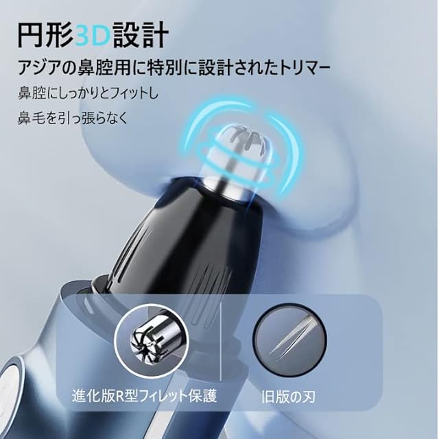 【高速静音モーター・360°両回転両刃】鼻毛カッターは全銅DC、トップレベルの高トルクブラシレスマイクロモーターを採用し、カーボンブラシの摩擦音を効果的に低減し、損失を大幅に減す同時に耐用年数を改善し、更に13,000 rpmでスムーズに動作することもできます。精密な360°両回転両刃ステンレス刃を搭載し、太くて硬い鼻毛や耳毛も楽にカットできます。刃は人間工学に基づいた 3D デザインを使い、保護キャップ付き、刃の円形形が 360 度のスリットから入る鼻毛を捉えます。鼻腔にしっかりとフィットし、鼻毛を引っ張らなく、鼻の内部を傷つけなく、更に抗アレルギー、もっと安全で快適に使用できます。
