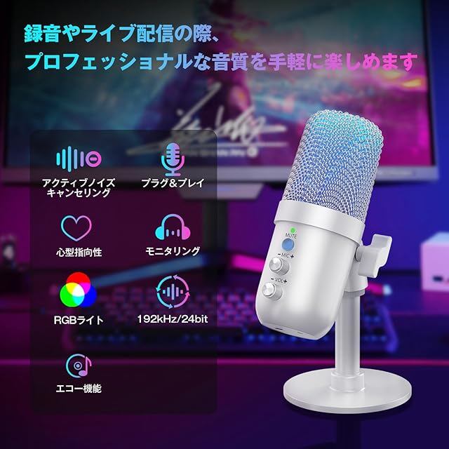 商品名:コンデンサーマイク USB マイク ゲーミングマイク PC 卓上 192kHz/24bit アクティブノイズキャンセリング エコモード搭載 RGBライト カーディオイド 静音機能付き 高感度 集音 多機能 プラグ&プレイ パソコン対応 配信/録音/ゲーム/会議用 Windows/Mac/PS5対応(ホワイト)