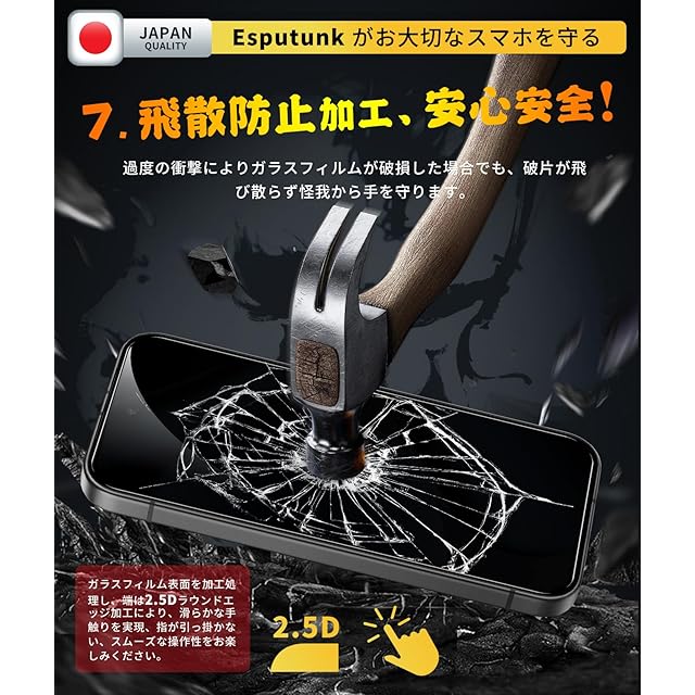 【日本旭硝子素材採用!硬度9H・飛散防止でさらに安心!】:日本製旭硝子素材を採用しており、高品質な素材で衝撃を緩和し画面の破損を最低限まで抑えます。高品質製品の製作プロセスに厳しく基づき、ガラス420°高温強化時間6時間、め七つのステップを経てスマホに完璧的にフィットした製品を製造されます。特殊な飛散防止設計により、万一割れてしまった際にも飛散することなく、高い安全性を実現します。本体に圧倒的なフィット感も実現しています。すり傷や指紋からもスクリーンをしっかりと保護します。