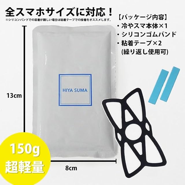 【速攻配達】冷やスマPRO 盛夏用 スマホ熱中症対策 冷却 クーラー スマートフォン専用常温保冷剤 熱暴走 結露なし スマホ 冷感 冷却 HIYASUMA<br><br>■特徴<br><br>スマホが発熱して動作不良を起こしたことはありませんか?<br><br>また、発熱することでスマホのバッテリーが<br>劣化していくとをご存じですか…?<br>発熱はバッテリーの消耗だけでなく、様々なトラブルの原因となります。<br>冷やスマで温度上昇を防え、強制終了や熱暴走対策に!<br><br>スマホ専用常温保冷剤!冷やスマの登場!<br><br>スマホの熱を吸収し、充電や冷蔵庫で再度冷やすことなく常温で繰り返し使える特殊な保冷剤がこの「冷やスマ」です。<br>常温での冷却のためスマホ内部の結露も心配ありません。<br>常温で繰り返し使え、ラバーバンド又は専用シールで簡単装着できWEB会議やゲームアプリの使用、<br>長編映画をスマホで見る際にも大活躍です。様々なシーンで大活躍!<br><br>※全スマホ対応サイズですが、ゴムバンドでの固定が難しい場合は粘着テープでの固定をオススメします。<br><br>※一般的な保冷剤をスマホに使用するのは危険です!<br> 一般的な保冷剤を使用すると急激な温度変換、定価によりスマホ内部で水滴が発生し故障の原因となります。<br> 機器内で発生するので防水仕様のスマホでも危険です!<br><br>※本品を冷蔵庫や冷凍庫で凍結させないで下さい。<br> 熱を吸収し、柔らかくなった場合は、常温の涼しい場所で置いておくと固まります!<br> 消耗品となります。繰り返しの使用が可能ですが、固まらなくなった場合は買い替え時です。<br><br>【パッケージ内容】<br>冷やスマ本体×1<br>固定用バンド×1<br>専用粘着シール×2<br><br>■カラー<br>ホワイト<br>※カラーは各々のモニターにより、多少の違いがある事、ご了承下さいませ。<br><br>■サイズ cm<br>13×8×1<br>150g<br><br>※厚みが液状化により±0.5cmほど変化する場合があります。<br><br>■素材<br>ポリオキシエチレングリコール<br><br>■メーカー<br>Six Grad合同会社