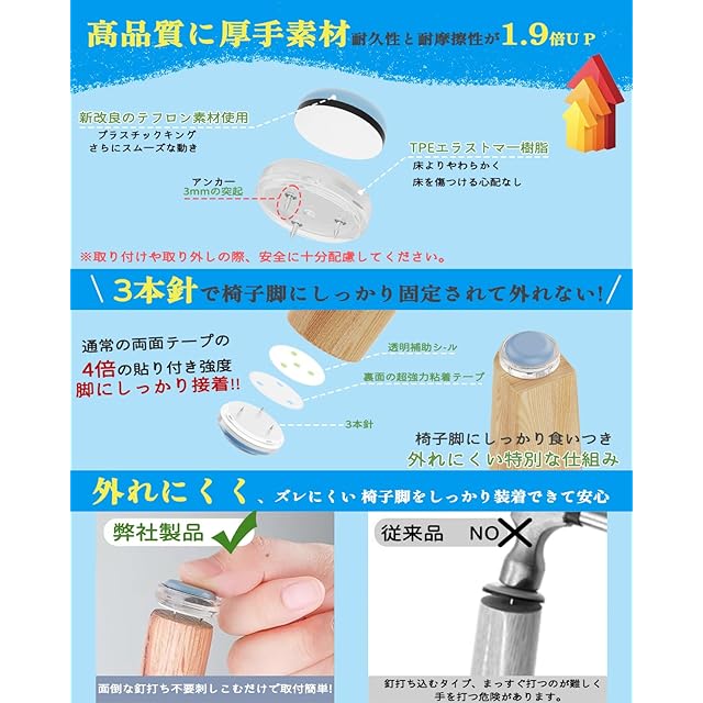 改良テフロン 材質を採用、滑らかさ 4.3 倍・耐摩耗性 1.9 倍向上。 TPE エラストマー接触面で床の傷・衝撃音防止。 ※木製脚のみ対応。金属脚 / 非水平脚等使用不可。 特許番号:3250438